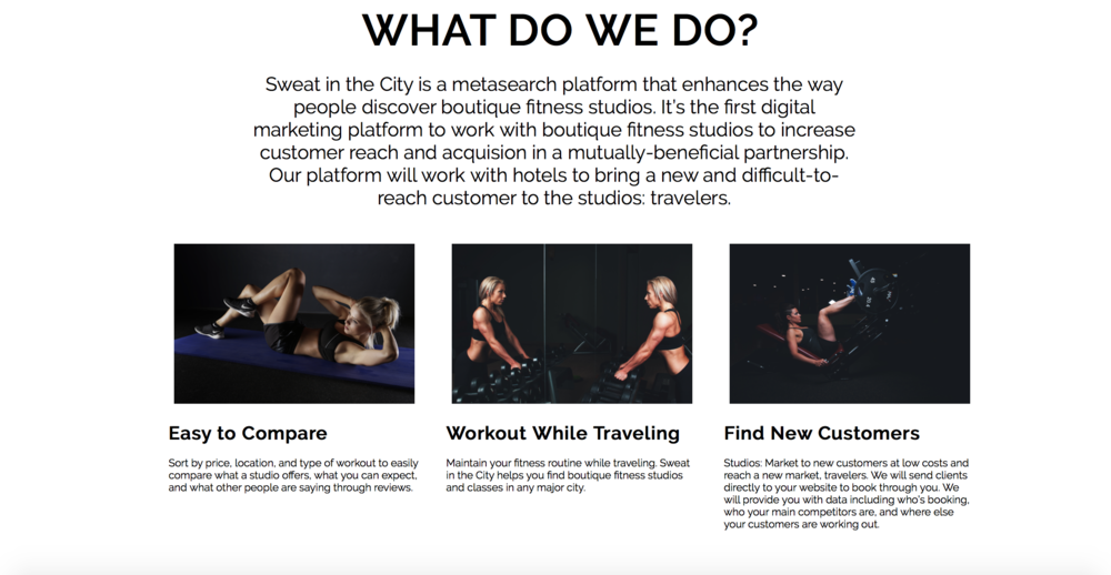 Sweat in the City is a website where people who are traveling are able to search up workout classes and gyms in the area. This allows travelers to fulfill their workout needs. Often times when classes are looked-up online only major gyms appear. This site provides all this information in the click of a button.